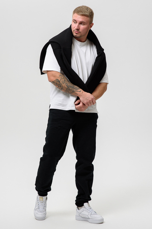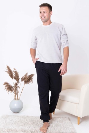 Мужское трико из футера с начесом. Пояс на резинке, по бокам имеются карманы, однотонная черная расцветка, прямой покрой. Возможно под брендом Натали.