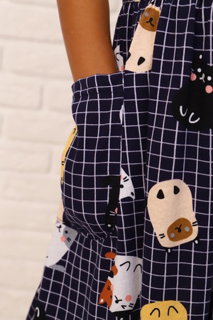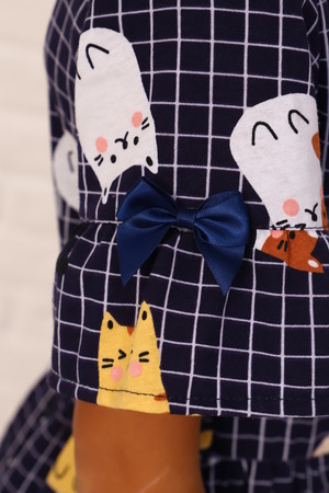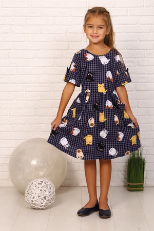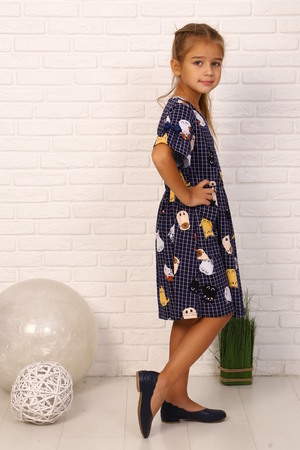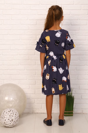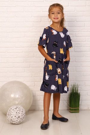 Платье для девочек дошкольного и младшего школьного возраста, из трикотажного полотна с рисунком. Платье прилегающего силуэта, отрезное и расклешенное от линии талии, с втачным рукавом и карманами спереди. Нижние части переда и спинки присборены на резинку. Спереди на нижней части настрочены карманы. Верхний срез карманов подогнут. Рукава короткие, с воланами. Воланы присборены. Нижние срезы воланов подогнуты. Горловина окантована. Низ платья подогнут. На рукава по линии притачивания воланов прикреплен декоративный элемент.