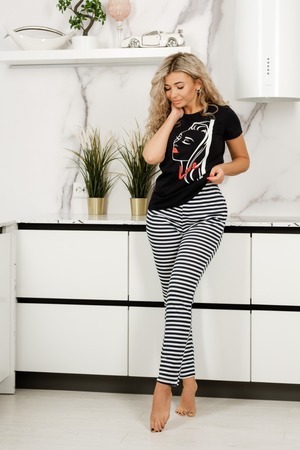 Пижама женская с брюками. Выполнена из натурального хлопка. Футболка украшена стильным принтом. Брюки в данной модели имеет полуприлегающий покрой и удачно подчеркивают достоинства фигуры. Выполнена из натурального хлопка, дизайн - всегда актуальная полоса, расположенная по длине изделия, визуально удлиняет и придает стройность фигуре.