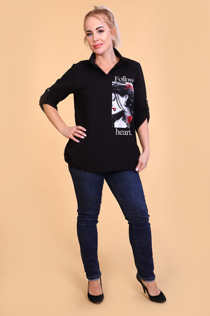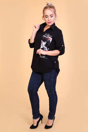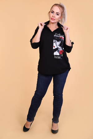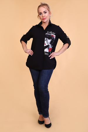 Стильная женская туника-рубашка с фешенебельным принтом на полочке выполнена в стиле oversize. Модель дополняет рубашечный воротник со стойкой, паты на рукавах и по низу изделия, закреплённые декоративными пуговицами. Чёрная рубашка oversize - неотъемлемый элемент базового гардероба и один из нетривиальных неформальных стилей, что сегодня является невероятно популярным. Данное изделие одаривает женщин возможностью быть свободными в своих фешн-предпочтениях, чувствовать себя максимально комфортно и уверенно.