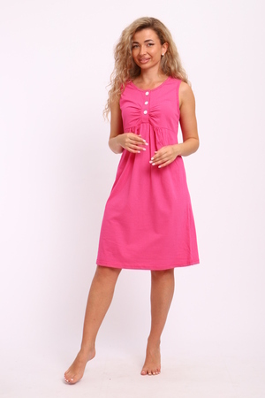 Женская сорочка без рукавов. Данная модель выполнена из трикотажного полотна кулирка (хлопок 100%). Полочка отрезная под грудью, шов фигурный. Верхняя часть полочки (лиф) имеет сборку по центру груди и планку на пуговках. Верх нижней части полочки по центру также со сборкой. Горловина и пройма изделия обработаны окантовкой из основной ткани. Отлично подходит для беременных и кормящих мам.