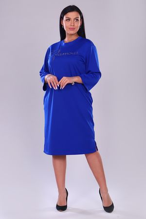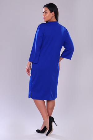 Платье женское прямого покроя. Округлый вырез отделан кантом. Рукав 7/8. Боковые карманы. По низу изделия с левой стороны разрез. На груди оригинальная наклейка из страз. Благодаря универсальности платье выглядит уместно в самых различных ситуациях.