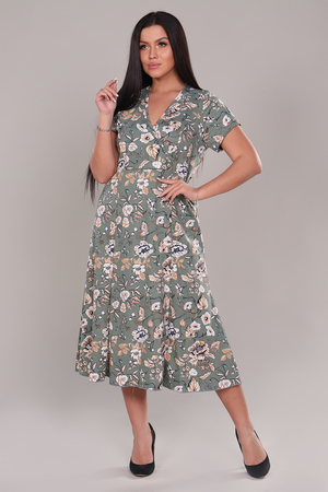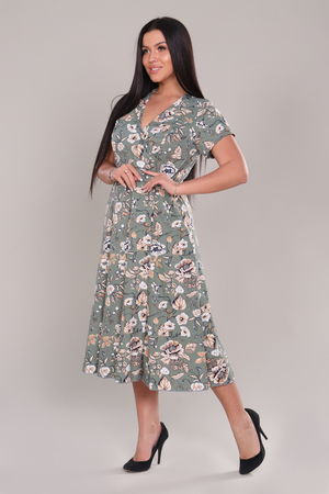 Платье женское очень красивой и оригинальной расцветки выполнено из ткани хлопок. Платье удлиненное, приталенное, с расклешением к низу. Вырез платья V-образный за счет запаха на полочке, что придает изделию элегантность и комфорт. Модель подойдет для прогулок, отдыха и дома.