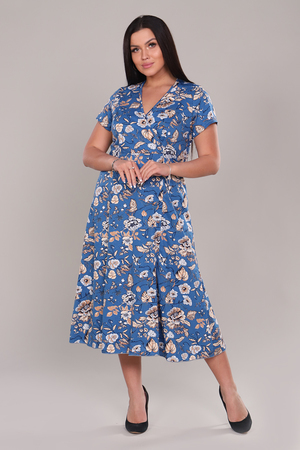 Платье женское очень красивой и оригинальной расцветки выполнено из ткани хлопок. Платье удлиненное, приталенное, с расклешением к низу. Вырез платья V-образный за счет запаха на полочке, что придает изделию элегантность и комфорт. Модель подойдет для прогулок, отдыха и дома.