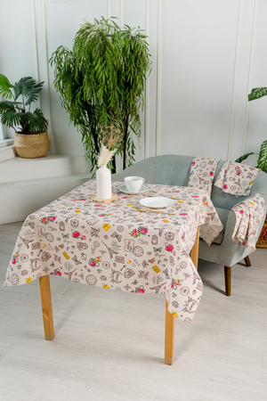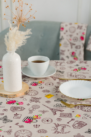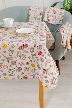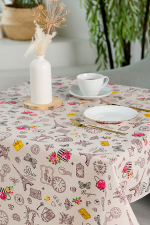 Скатерть из рогожки "Мадам" отлично подойдет для интерьера любой кухни. Лаконичный нежный дизайн с французским мотивом будет радовать глаз и украшать обеденный стол.