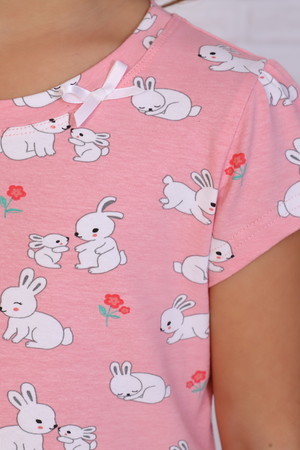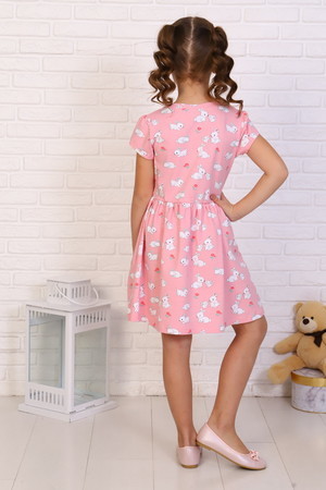 Платье для девочек дошкольного и младшего школьного возраста, из трикотажного полотна кулирка с лайкрой с рисунком. Платье прилегающего силуэта, отрезное и расклешенное от линии талии, с втачным, коротким, одношовным рукавом, с обтачкой в горловине. По окату рукава небольшая сборка. Низа рукавов и нижней части платья подогнуты. По шву втачивания обтачки в горловину проложена отделочная строчка.