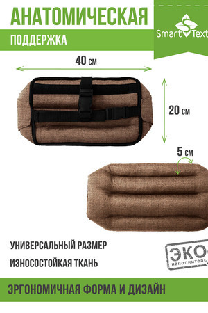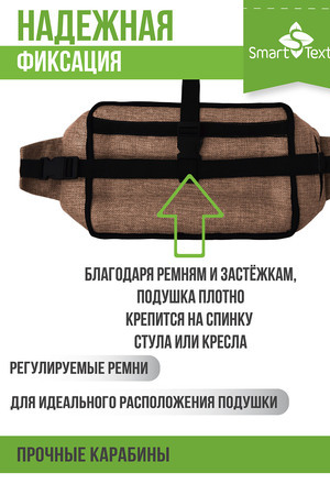 Подушка под поясницу крепится к спинке кресла или офисного стула с помощью регулируемых ремешков. Используемые материалы износоустойчивые, воздухопроницаемые и гипоаллергенные.