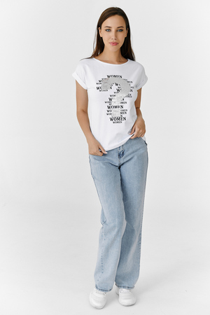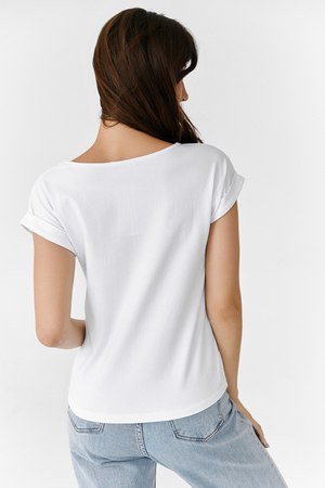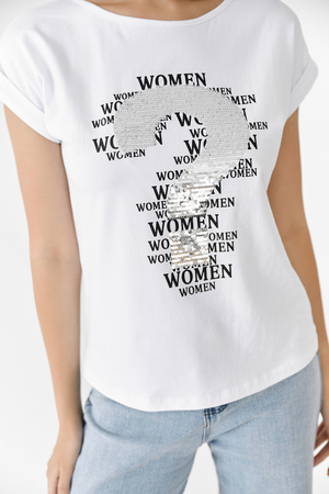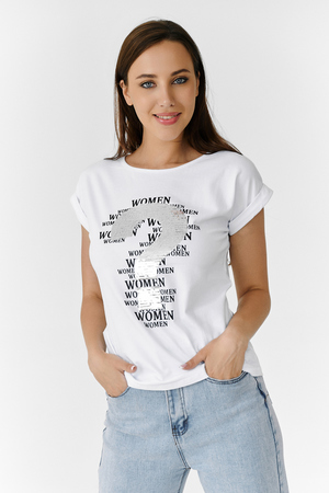 Футболка полуприлегающего силуэта, средней длины, с округлой горловиной. Рукав цельнокроеный, короткий, на манжете с отворотом. На полочке эффектная печать с аппликацией из пайеток