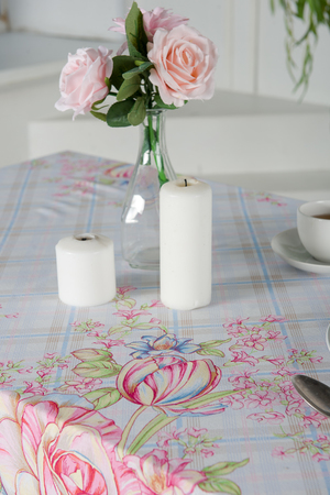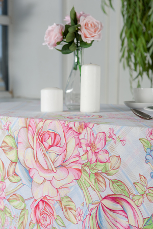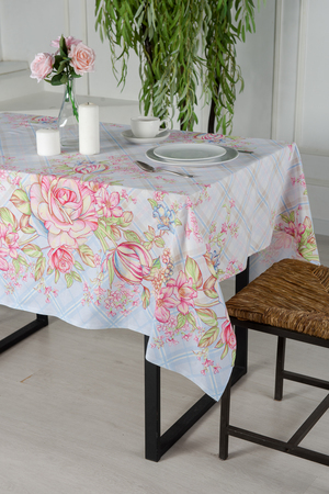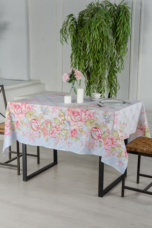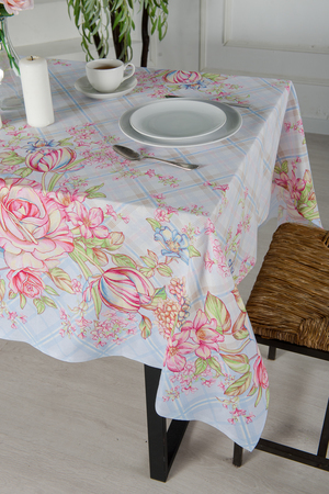 Светлая скатерть из рогожки Весенний букет станет отличным украшением кухонного стола. На полотне нанесен ненавязчивый рисунок, большие и маленькие цветы на розовом и голубом фоне. Благодаря особой износоусточивости и практичности скатерти из рогожки так полюбились многим домохозяйкам. К скатерти так же можно купить набор полотенец Весенний букет оптом и в розницу.