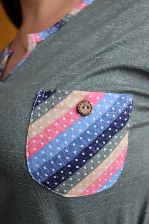 Костюм женский: туника и бриджи. Туника полуприлегающего силуэта с фигурным Y-образным вырезом. Рукав короткий цельнокроенный со швом. На полочке нагрудный карман с пуговицей, из отделочной ткани в полоску. В боковых швах туники и бриджей небольшие разрезы. Бриджи из ткани в полоску, длина ниже колена, на передних частях внутренние карманы, пояс обработан на многоигольной машине. На модели 52 размер