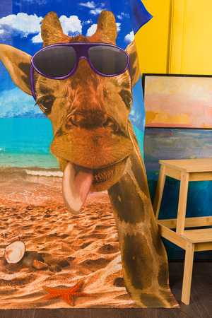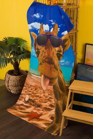 Банное вафельное полотенце с изображением веселого жирафа, размером 150*80, отлично подойдет для как для бани, так и для пляжа.