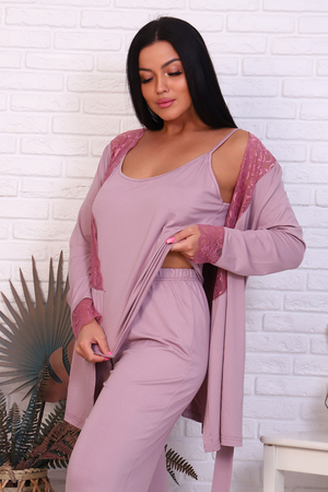 Домашний костюм из вискозы - майка на бретелях, кофта запашная по пояс, отделка кружевом, брюки прямого покроя.