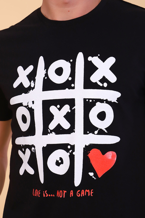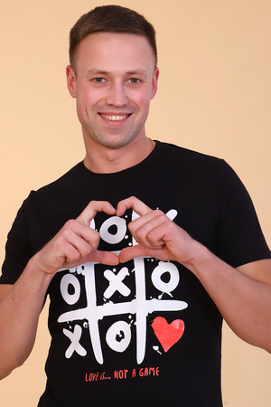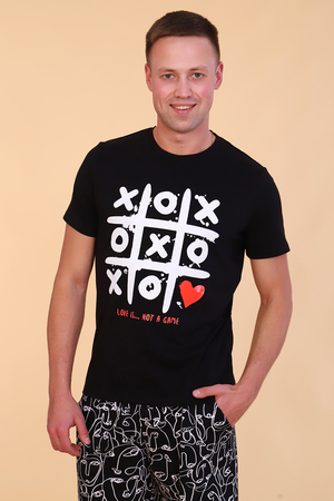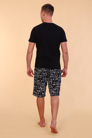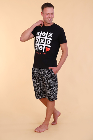 Мужской костюм состоит из футболки и шорт. Станет идеальным подарком для влюбленных. Футболка из гладкокрашенного трикотажного полотна, полуприлегающего силуэта с яркой и оригинальной печатью на полочке. Рукав втачной короткий. Горловина округлой формы обработана обтачкой. Низ изделия и рукавов подогнут. Шорты из трикотажного полотна со стильным принтом, полуприлегающего силуэта с карманами формы "хулиган" и притачным широким поясом. Низ изделия подогнут.