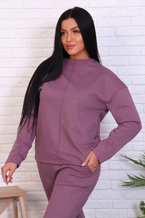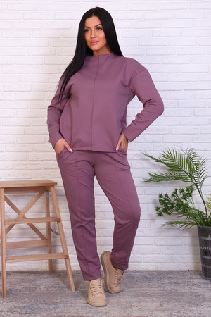 Стильный базовый костюм из хлопкового трикотажа отличного качества. Брюки прямого кроя, зауженные к низу, высокая посадка с простроченными стрелками, низ без резинки(не режет ногу), карманы в швах. Трикотажный джемпер длиной до середины бедра. По центру переда декоративный вертикальный защип вытягивает и стройнит. Горловина джемпера с цельнокроеной стойкой, обработана притачной обтачкой. Рукава джемпера длинный двухшовный, рубашечного кроя, линия плеча спущена. Полные размеры