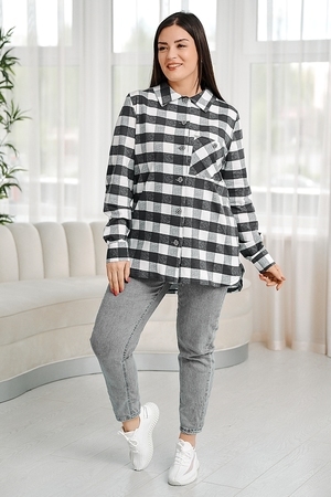 Туника женская прямого силуэта с отложным воротником. Застежка на петли - пуговицы. Рукав длинный, втачной с манжетой. Низ туники фигурный, спинка несколько длиннее полочки. На полочке нагрудный карман. На модели 52 размер
