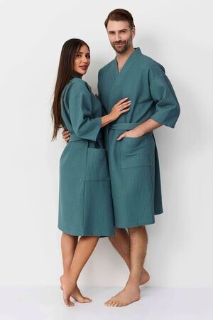 Вафельный халат-кимоно. Рукав 3/4. Карманы накладные. Воротник планка. Размерный ряд от 44/46 до 64/66. Плотность вафельного полотна 242 гр.