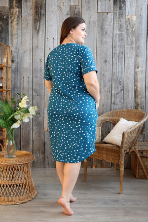 Халат на пуговицах со спущенной проймой, горловина и короткий рукав отделаны кантом, как и вход в боковой карман. Средней длины ниже колена. На модели размер 52