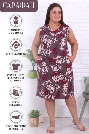 Сарафан женский из 100% натурального хлопка, прямого кроя, в боковых швах внутренние карманы. Удобная модель для повседневной носки, а так же для дачи, для отдыха. Нежная расцветка создаст женственный образ.