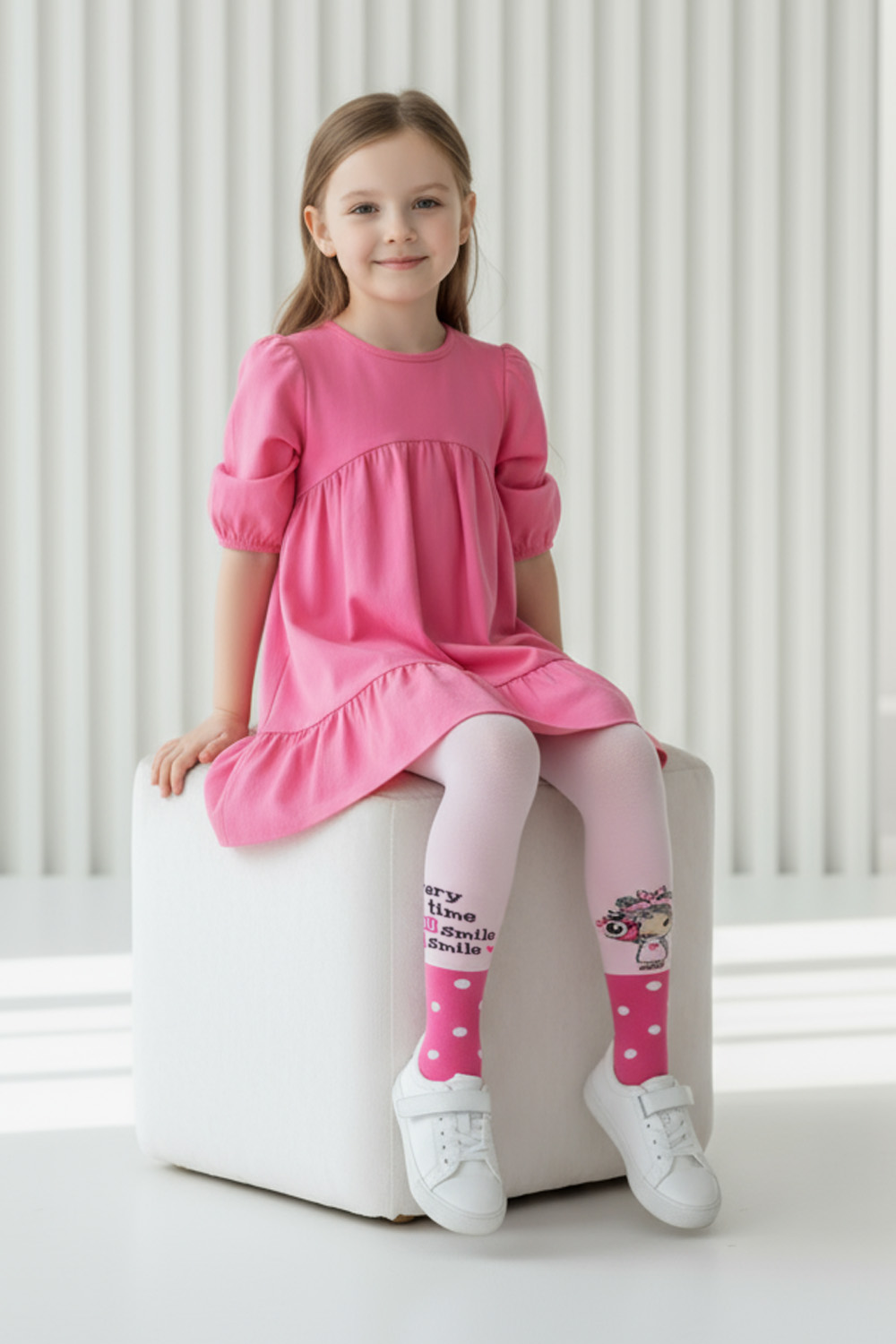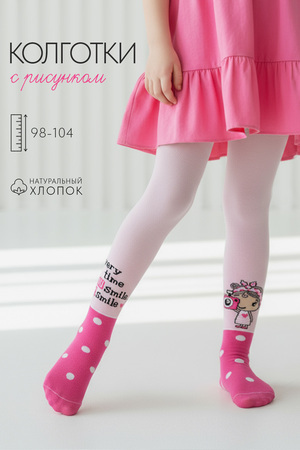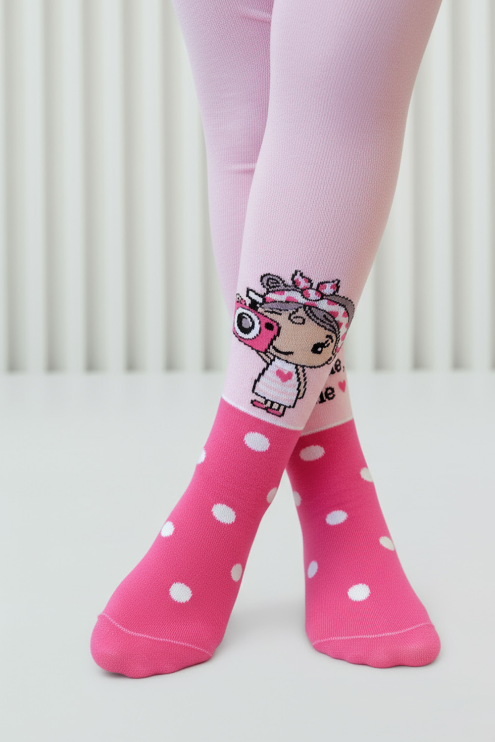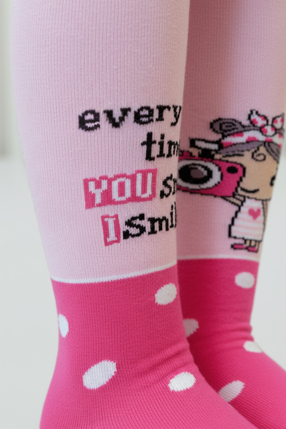 Яркие детские колготки с рисунком в виде девочки с фотоаппаратом и надписью "Каждый раз, когда ты улыбаешься - я улыбаюсь"