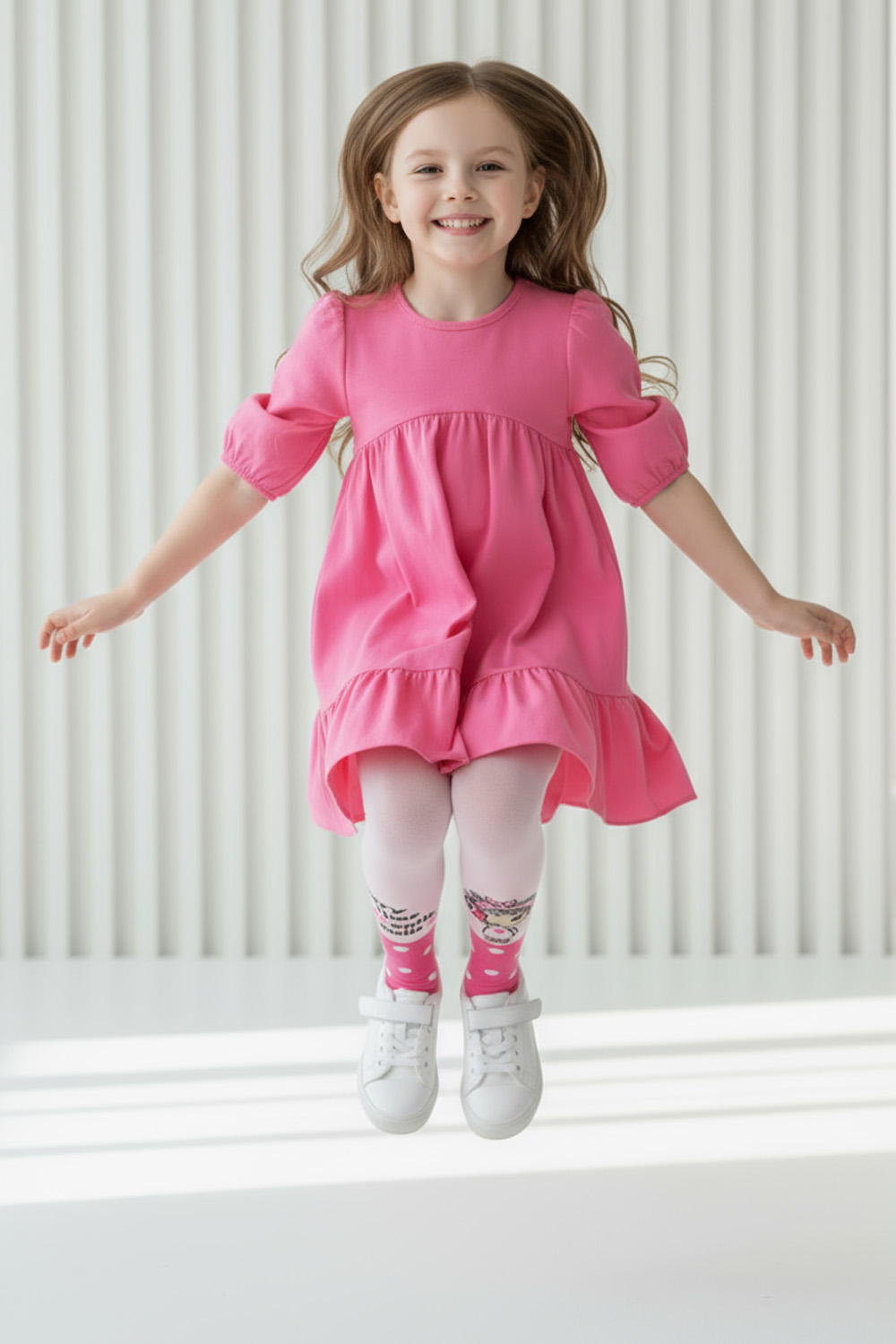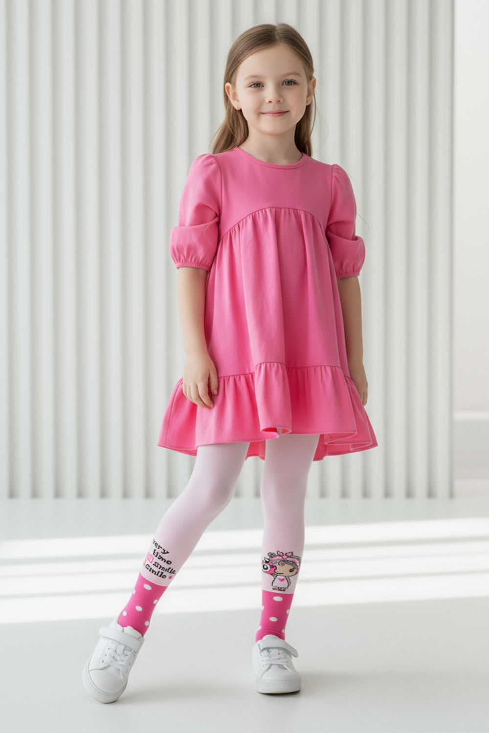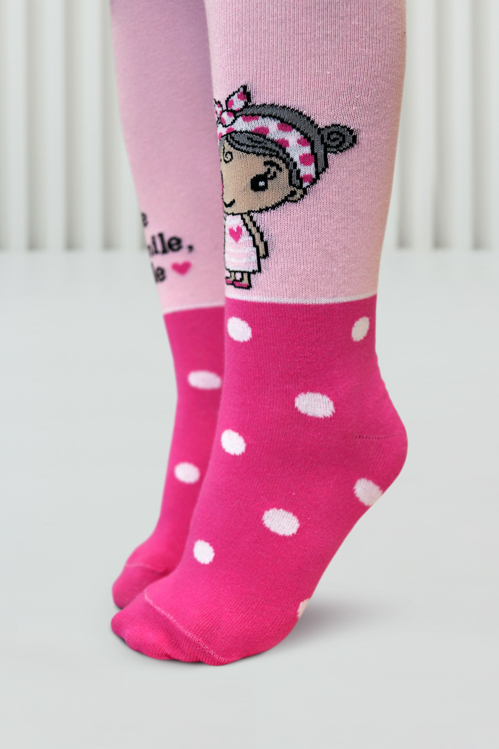 Яркие детские колготки с рисунком в виде девочки с фотоаппаратом и надписью "Каждый раз, когда ты улыбаешься - я улыбаюсь"