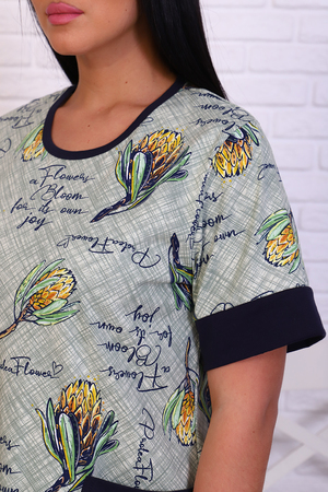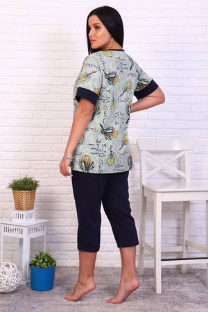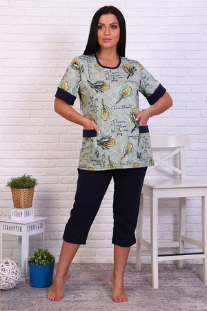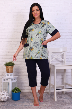 Женский костюм из кулирки футболка + бриджи. Футболка из набивной ткани с короткими рукавами на манжетах, сбоку два накладных кармана, бриджи из однотонной ткани