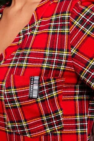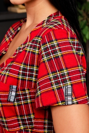 Халат на пуговицах, полуприлегающего силуэта, длиной выше колена, с округлой горловиной, с карманами в боковом шве, с фигурной линией низа и удлиненной спинкой. Рукав втачной, короткий. На левой полочке расположен накладной карман. Горловина и борта обработаны бейкой из основного полотна.