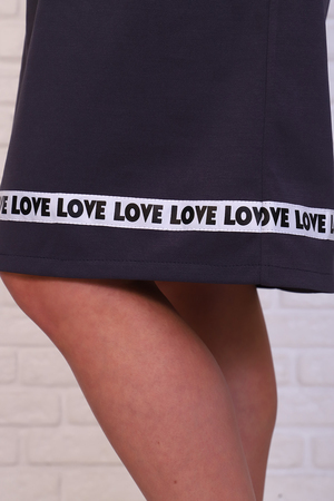 Платье женское прямого кроя. Горловина отделана кантом. Спущенный рукав на манжете. Фигурные накладные карманы. Через шлевки продет пояс из декоративной ленты. По низу изделия настрочена лента. Сбоку небольшой разрез.