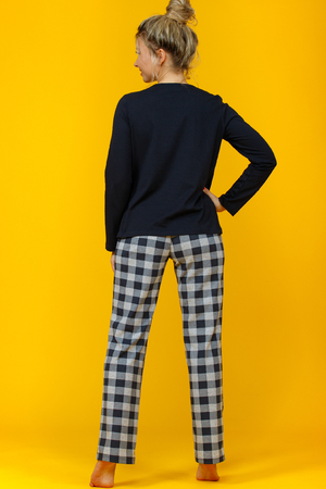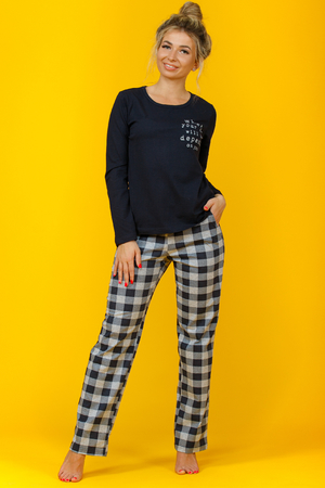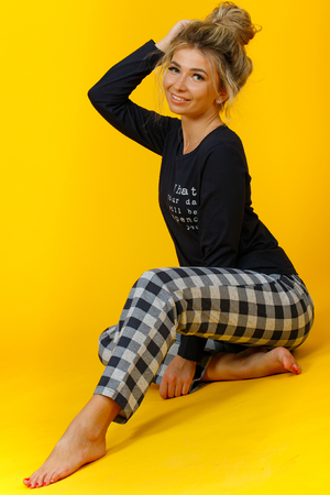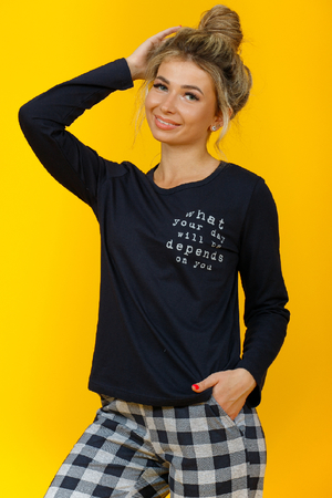 Комфортная и стильная пижама. Брюки в клетку с двумя боковыми карманами и футболка с длинным рукавом, с печатью на полочке - "Каким будет твой день, зависит от тебя".