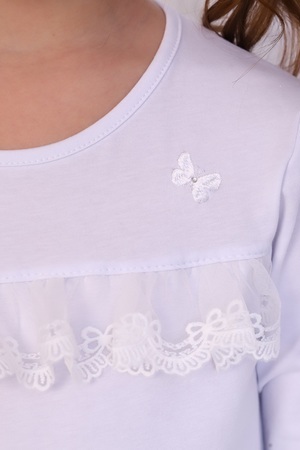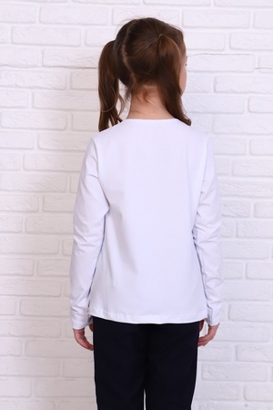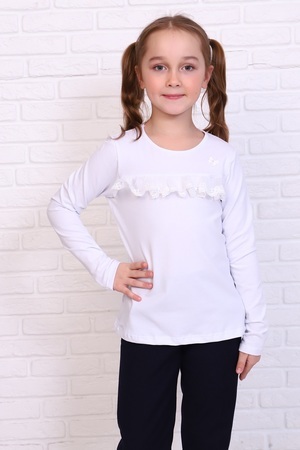 Джемпер для девочек младшего и старшего школьного возраста, из трикотажного полотна кулирка с лайкрой. Джемпер прилегающего силуэта, с втачным рукавом. Спереди отрезная кокетка. В шов притачивания кокетки к нижней части переда вставлено присборенное кружево. На спинке отсутствуют линии членения. Рукав одношовный, длинный. Низа рукавов и изделия подогнуты. Горловина окантована. На кокетке сбоку вышит рисунок и прикреплен декоративный элемент.
