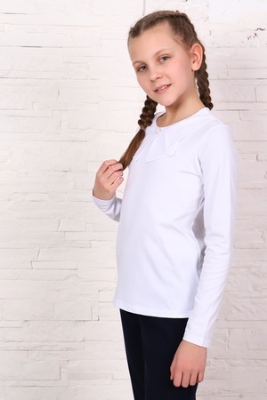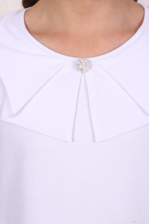Блузка для девочек младшего и старшего школьного возраста, из трикотажного полотна кулирка с лайкрой. Блузка прилегающего силуэта, с втачным рукавом, с центральной застежкой на спинке на петлю и пуговицу, с воротником из шифона. Спереди отсутствуют линии членения. На спинке вырез в виде капельки под застежку. Рукав одношовный, длинный. Низа рукавов и изделия подогнуты. Воротник состоит из двух частей со складками. Спереди по центру прикреплена брошь.