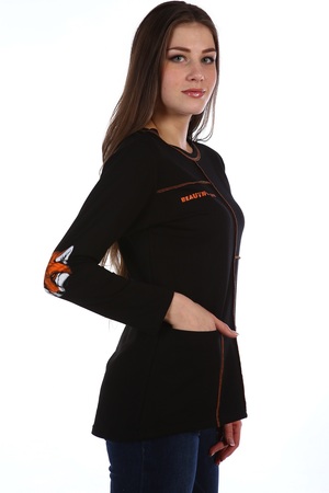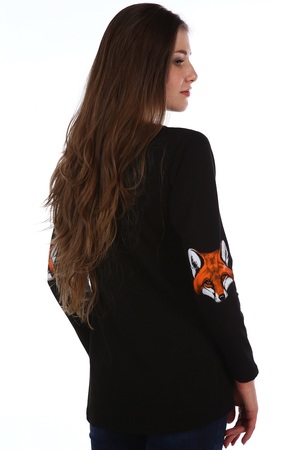 Темная кофта из футера с лайкрой. Оранжевая прострочка, принт в виде головы лисы на локтях, рукава до запястий. Размеры от 42 до 56.