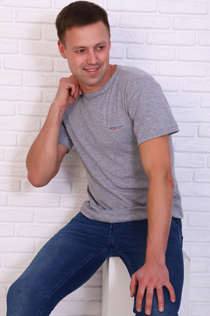 Мужская футболка из кулирки. Короткие рукава, круглая горловина, украшена печатью, прямой силуэт.