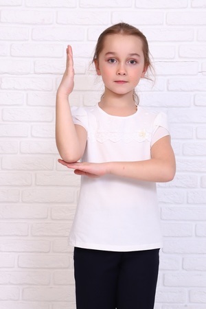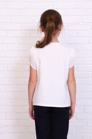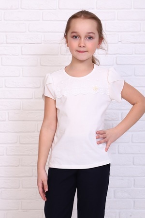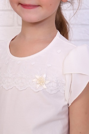Джемпер для девочки из трикотажного полотна кулирка с лайкрой с коротким рукавом. Джемпер полуприлегающего силуэта, с втачным рукавом из шифона, без застежки. Спереди на кокетке настрочено кружево, прикреплен декоративный элемент. Рукав короткий, из двух частей, присборенный по окату. Низ рукавов обметан на краеобметочной машине. Низ изделия подогнут. Срез горловины обработан узкой окантовочной лентой из того же полотна.