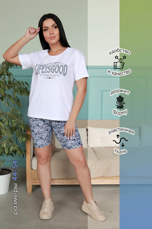 Удобный костюм из комфортной трикотажной ткани кулирка с лайкрой, в составе которой 95% хлопка и 5% лайкры. Ткань эластичная, удобная в носке и уходе, не теряет форму после стирки. Футболка свободного кроя, прямого силуэта. Рукав короткий, на спущенном плече. Облегающие, слегка удлиненные шорты на резинке. Хороший вариант для отдыха, прогулок и занятий спортом.