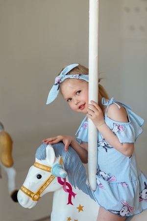 Сарафан детский летний для девочек полуприлегающего силуэта. Верх изделия оформлен пышной рюшей на тонких бретелях-завязках. По низу притачена пышная юбка в оборку. Низ рюши и юбки обработан декоративной краеобметочной строчкой.