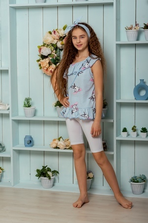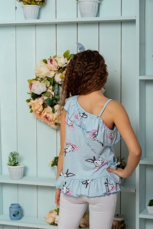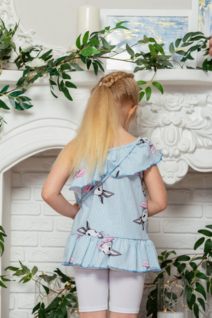 Майка детская летняя с декоративной сумочкой полуприлегающего силуэта. Горловина оформлена пышной рюшей на одно плечо с тонкой бретелью. По низу изделия притачена широкая отрезная рюша. Сумочка на бретели крепится в плечевой шов, верх сумочки обработан декоративной ажурной резинкой, по центру настрочен бантик из окантовки. Все срезы в изделии обработаны декоративной краеобметочной строчкой.