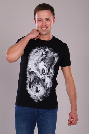 Мужская футболка из кулирки пенье. Горловина круглая, втачной рукав, рукава и низ футболки обработаны в подгибку. Футболка имеет печать на полочке. Стильная и современная, подходит для любого возраста.