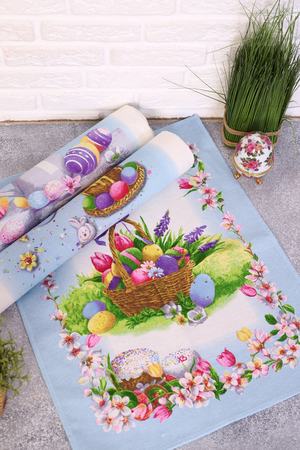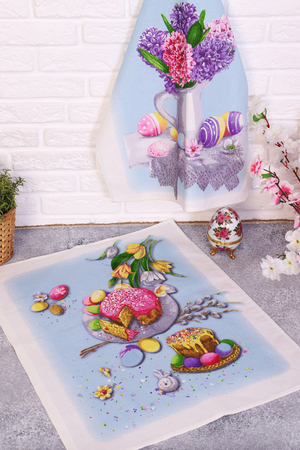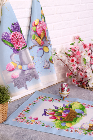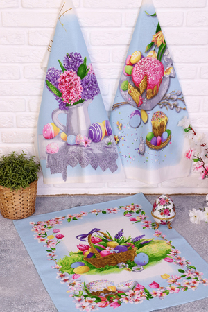 Набор из трех кухонных полотенец размером 60*48 см. Выполнены из прочного хлопчатобумажного полотна - рогожка. Отлично впитывают влагу, сохраняют цвет и форму после стирки. Каждое полотенце с индивидуальным рисунком, посвященным светлому празднику Пасхи. Порадуйте себя и своих близких приятным подарком на праздник.