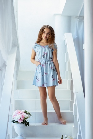 Платье детское летнее для девочек. Приталенного силуэта, на тонких бретелях, с накладным кармашком на полочке. По горловине, рукавам настрочена декоративная ажурная резинка. Линия талии собрана на потайную эластичную резинку. Все срезы в изделии обработаны декоративной краеобметочной строчкой.