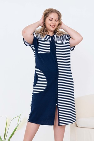 Халат женский домашний, средней длины на молнии, с комфортной посадкой по фигуре. Украшением изделия служит комбинирование тканей: полоска и однотонная ткань. С одной стороны полочки - отрезная кокетка с накладным карманом вверху и внизу. Ткань изделия - кулирная гладь 100% хлопок.