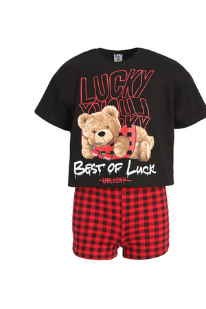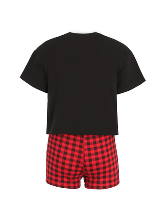 Костюм из легкой хлопковой ткани. Футболка с круглой горловиной, втачные рукава со спущенным плечом, на полочке украшение в виде принта. Шорты короткие, пояс на широкой эластичной резинке.