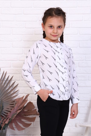 Туника для девочек младшего и старшего школьного возраста, из легкой ткани штапеля 100% вискоза. Туника прямого силуэта, с втачным рукавом. На спинке вырез в виде капельки под застежку петля и пуговица. Длинный рукав, низ рукава на манжете с петлей и пуговицей, спереди по центру заложены 2 складки и украшены бантиком.