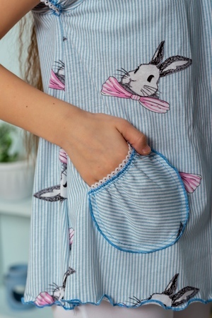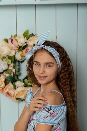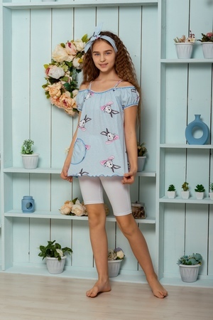 Майка детская летняя для девочек, свободного покроя на тонких бретелях, с накладным кармашком на полочке. По горловине и рукавам настрочена декоративная ажурная резинка. Все срезы в изделии обработаны декоративной краеобметачной строчкой.