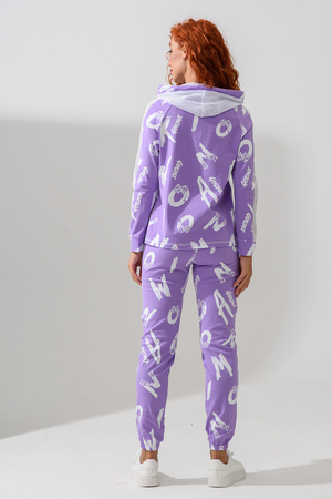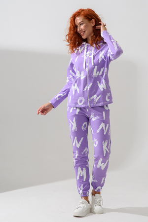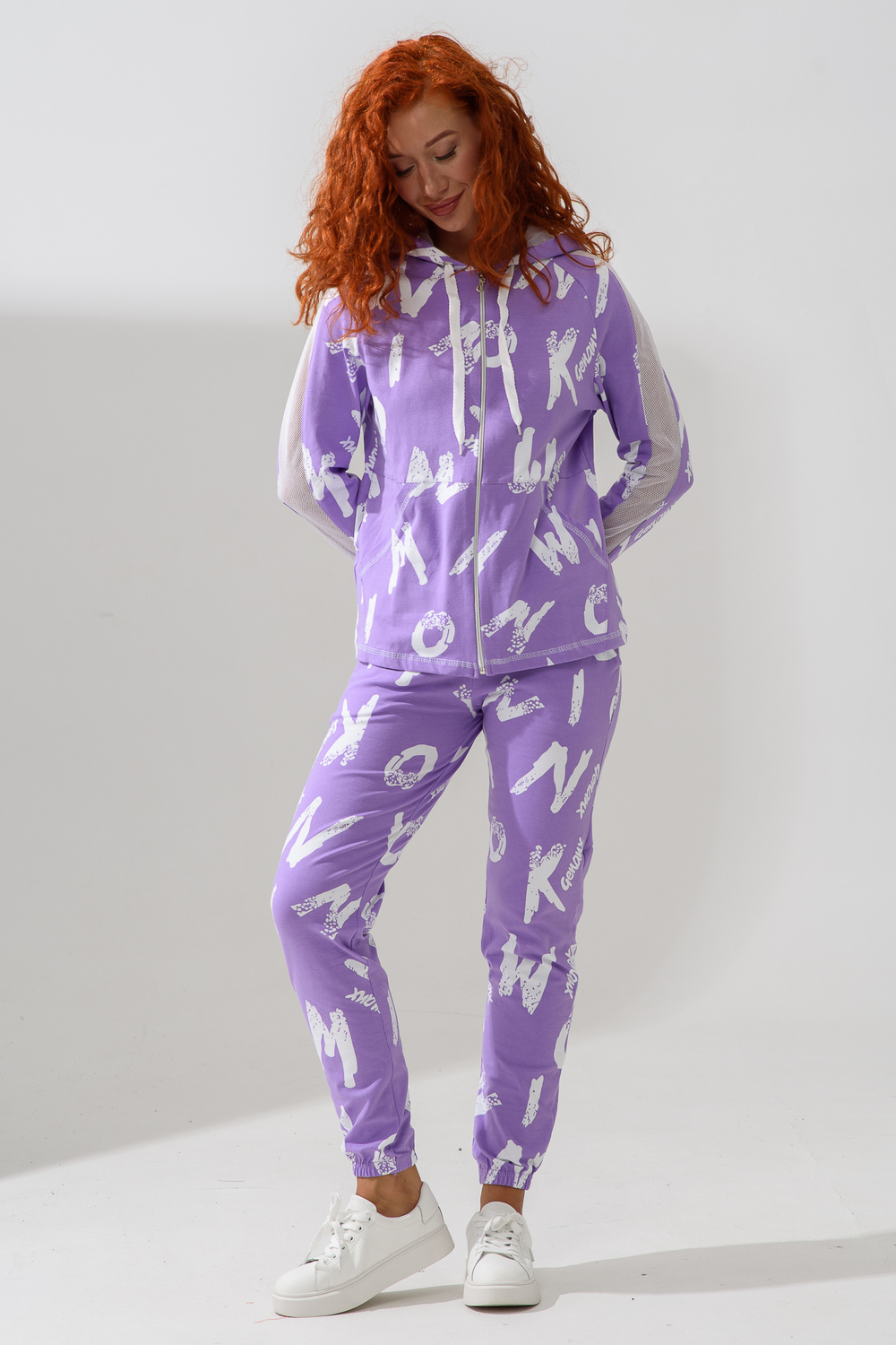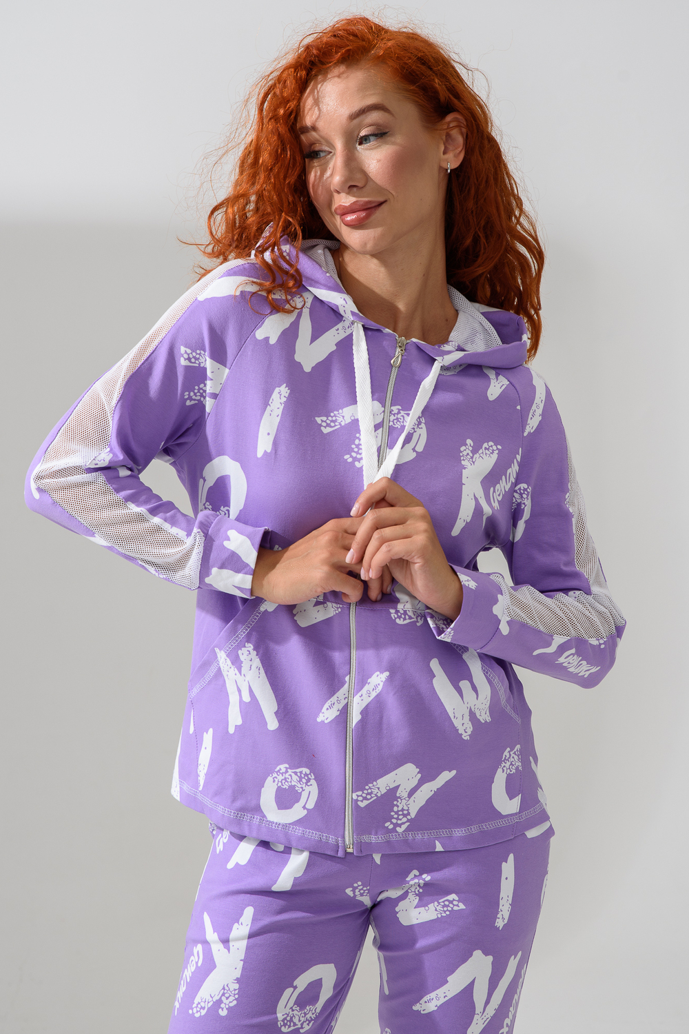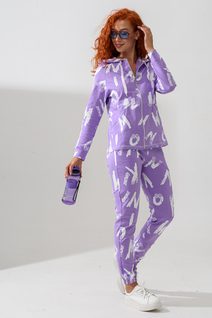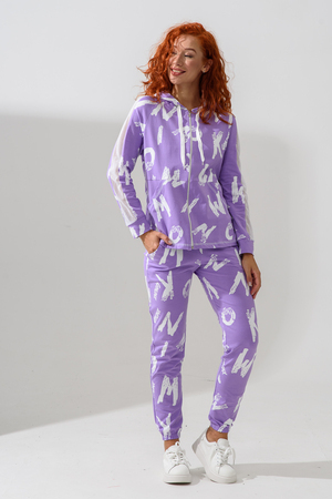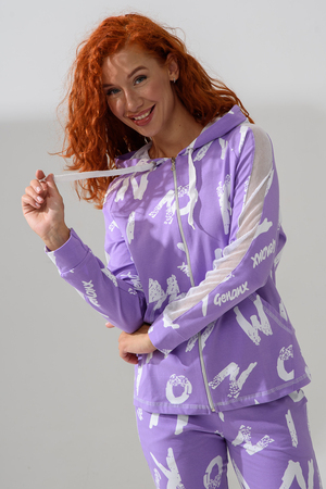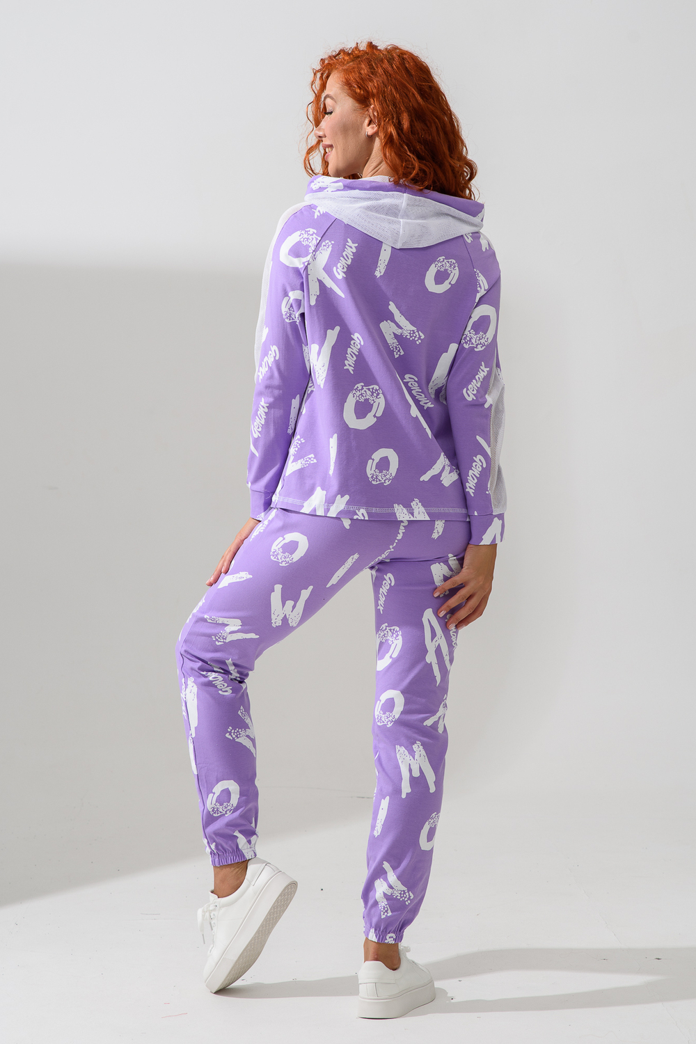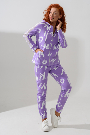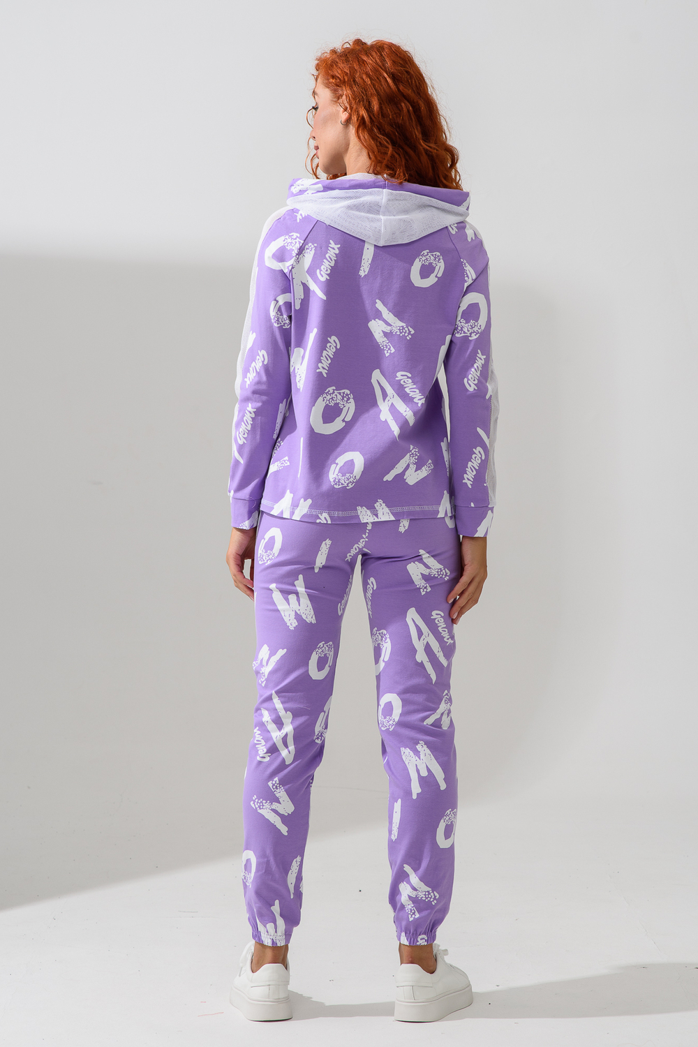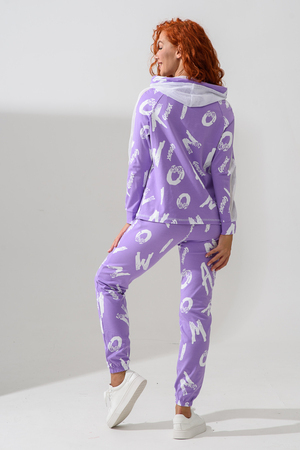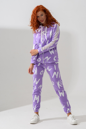 Костюм состоит из толстовки и брюк. Брюки на поясе, с боковыми карманами, на резинке по низу. Толстовка прямая, на молнии, с капюшоном из сетки, с карманами "кенгуру", длиной до середины бедра. Рукав реглан, длинный, с лампасами из сетки вдоль рукава, на манжете.