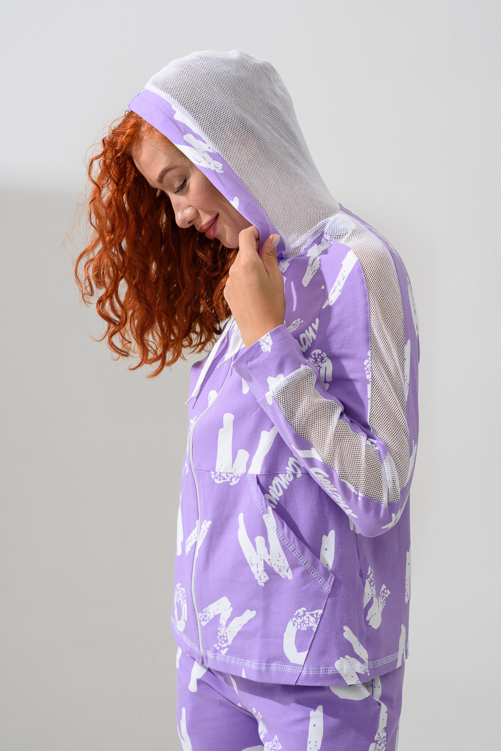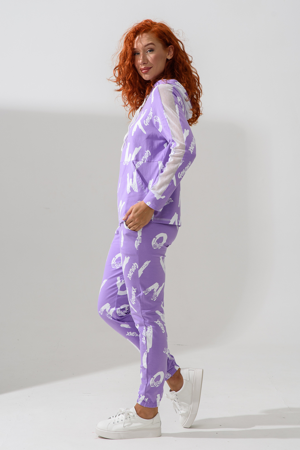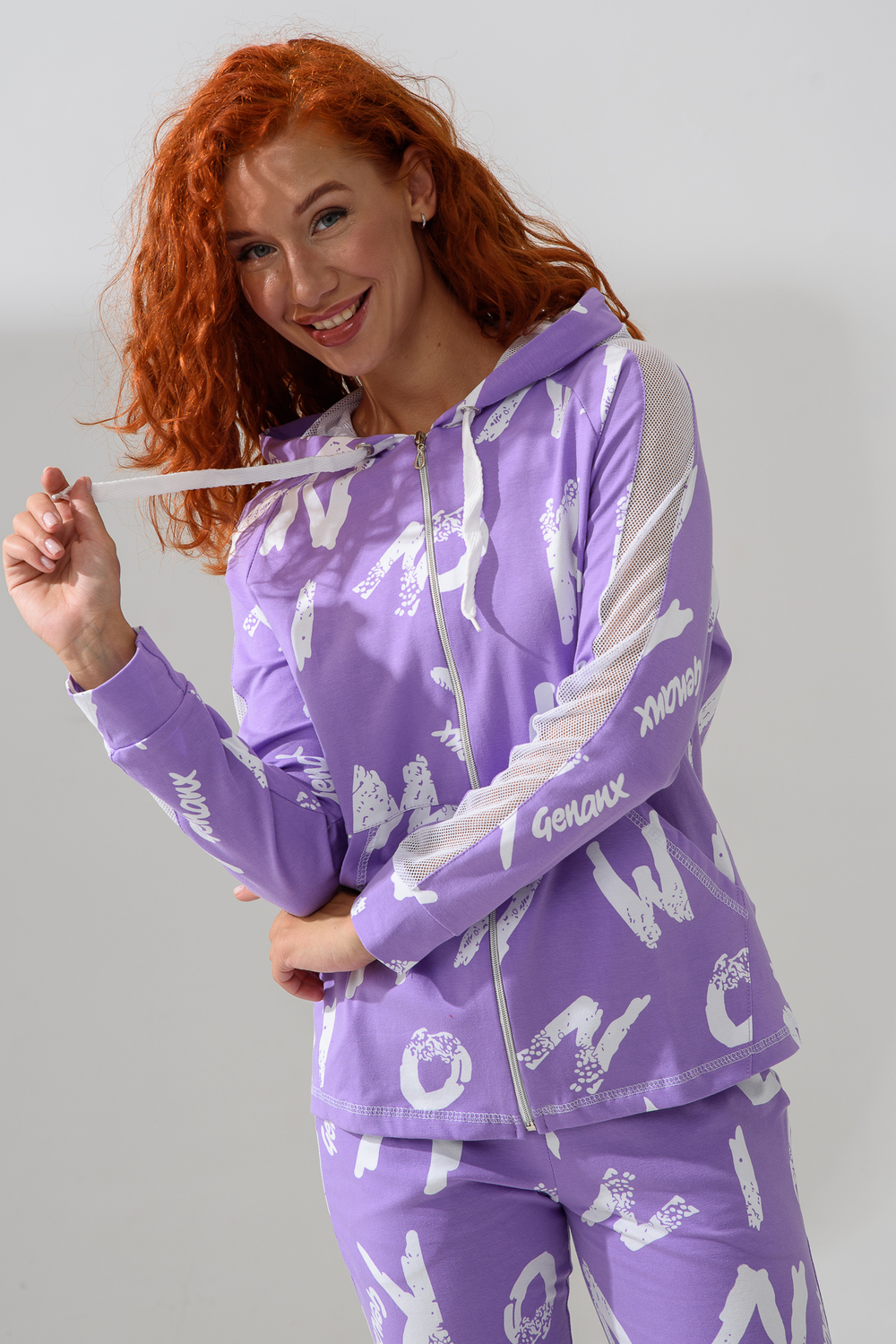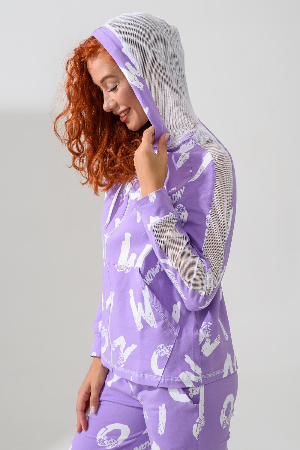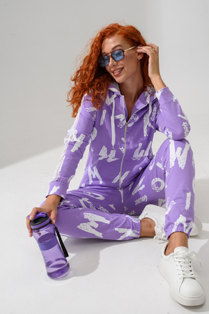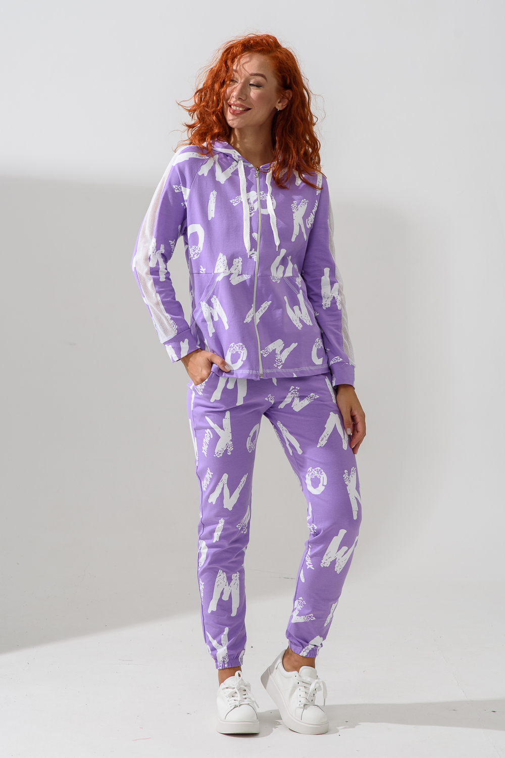 Костюм состоит из толстовки и брюк. Брюки на поясе, с боковыми карманами, на резинке по низу. Толстовка прямая, на молнии, с капюшоном из сетки, с карманами "кенгуру", длиной до середины бедра. Рукав реглан, длинный, с лампасами из сетки вдоль рукава, на манжете.