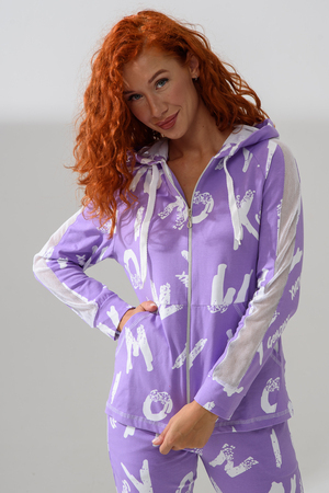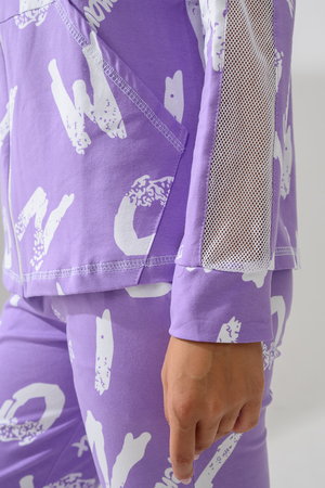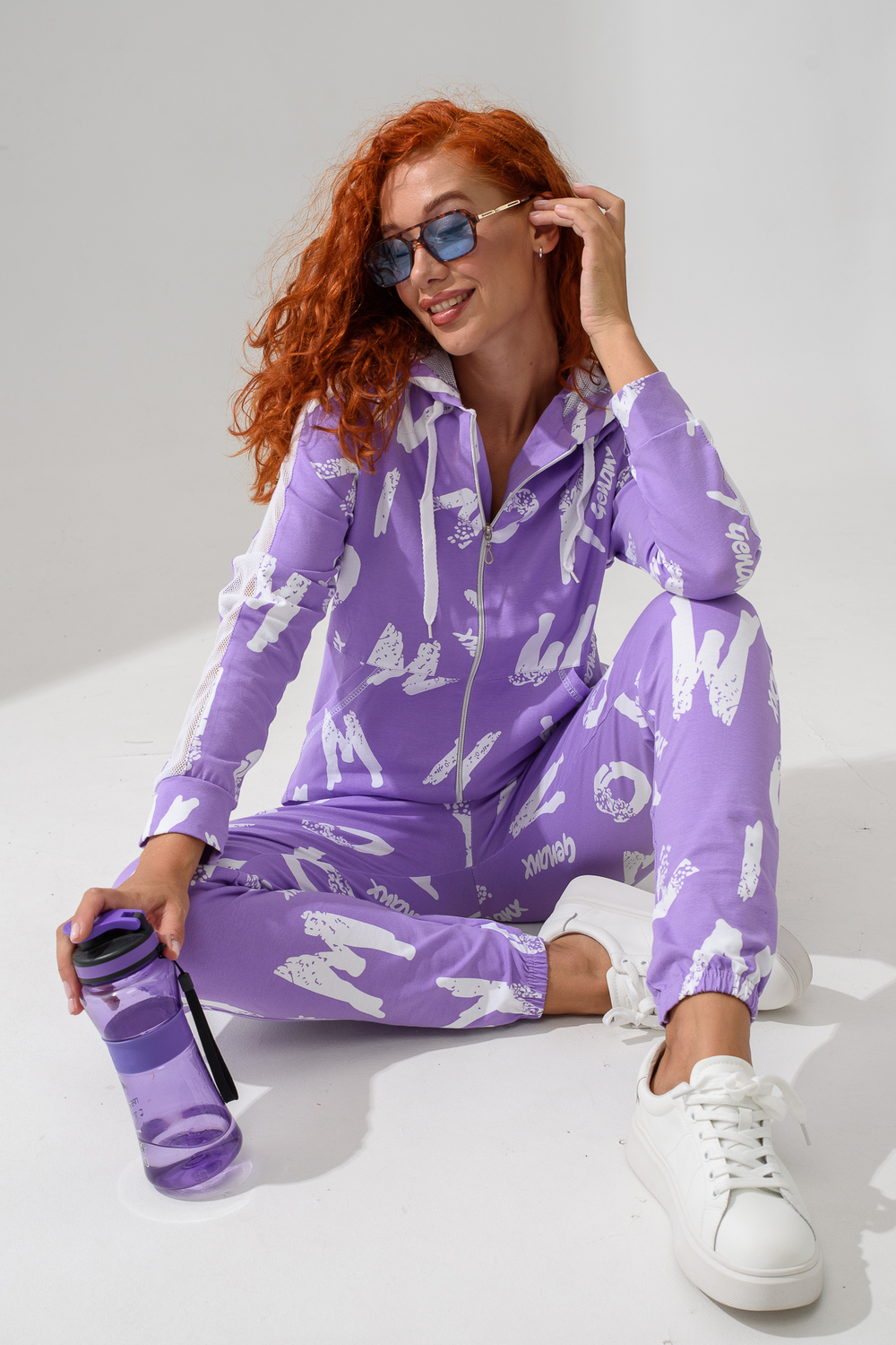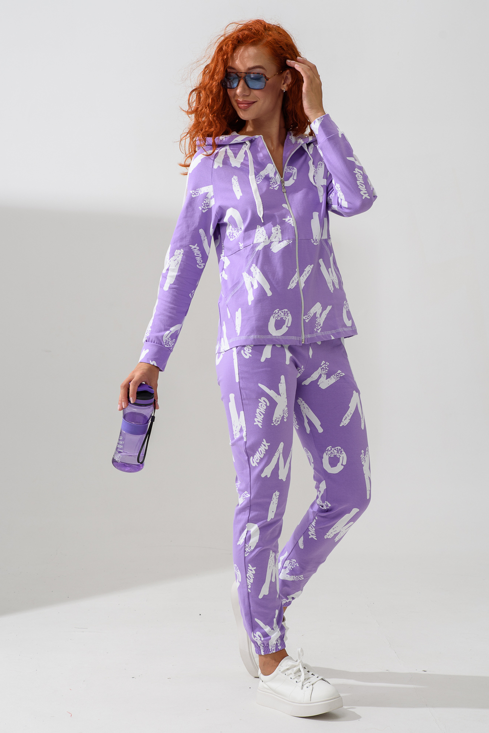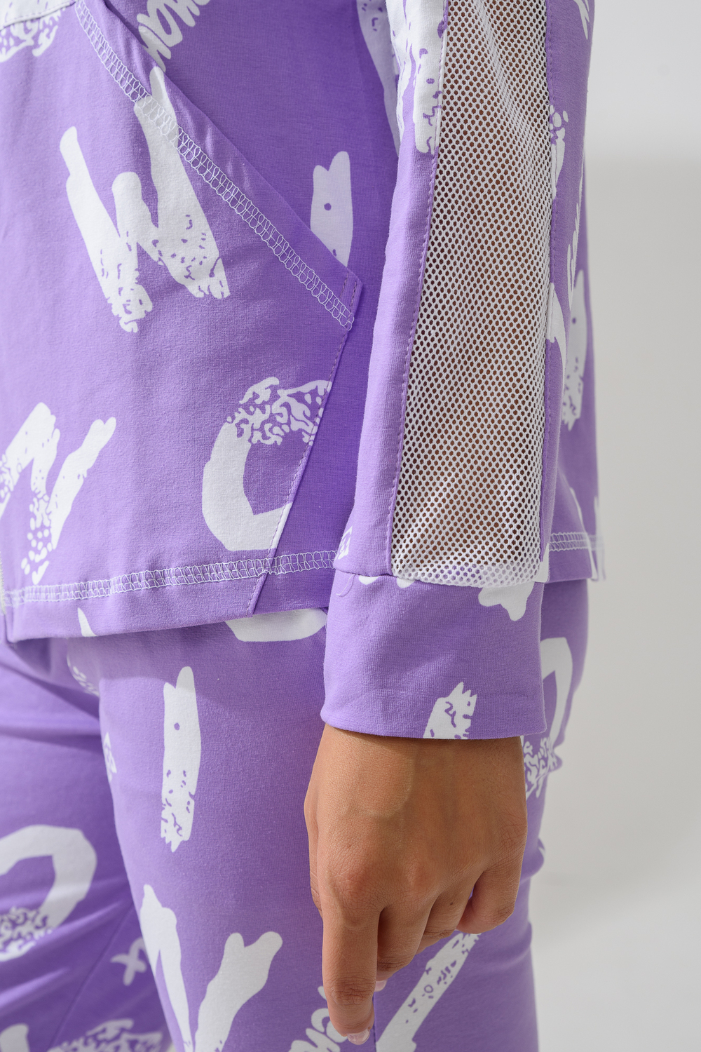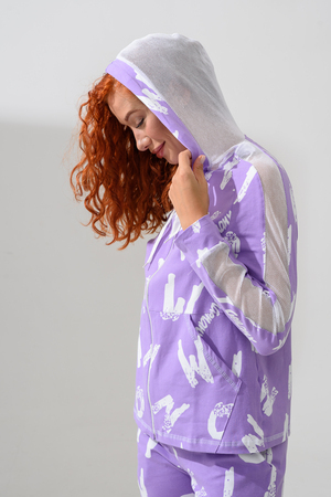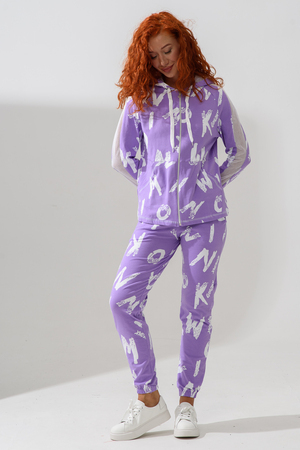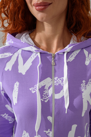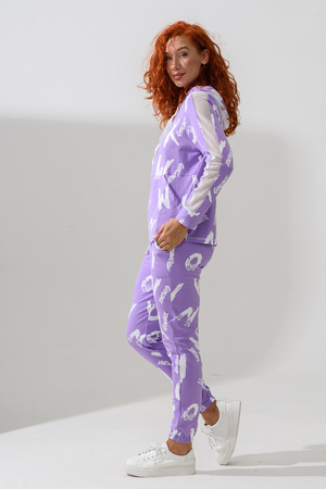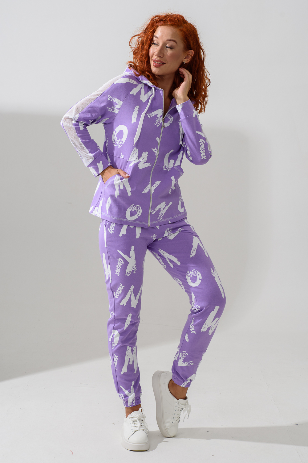 Костюм состоит из толстовки и брюк. Брюки на поясе, с боковыми карманами, на резинке по низу. Толстовка прямая, на молнии, с капюшоном из сетки, с карманами "кенгуру", длиной до середины бедра. Рукав реглан, длинный, с лампасами из сетки вдоль рукава, на манжете.