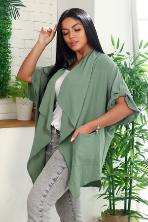 Кардиган женский с цельнокроенным рукавом, без застежки. Край борта закладывается в мягкие складки. На полочках накладные карманы. На модели 48 размер
