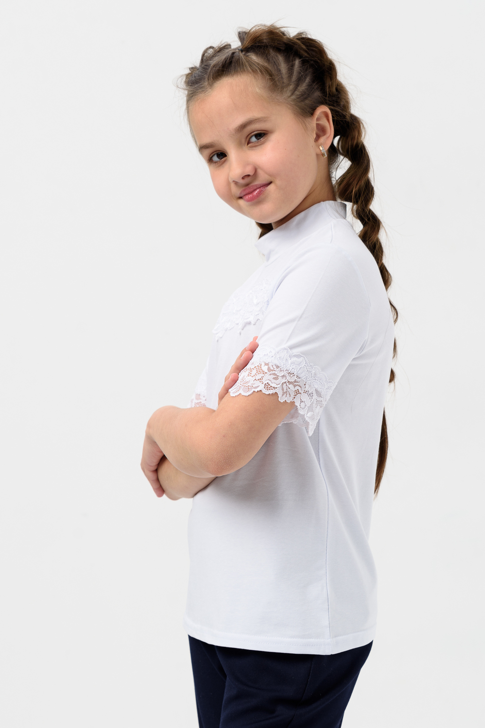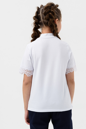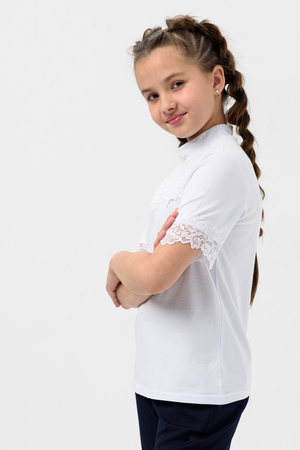 Школьная блузка для девочки с коротким рукавом. Мягкая трикотажная ткань и нежное кружево на рукавах и по переду изделия делают её универсальной - подходящей как для повседневной носки, так и для праздничных мероприятий. Узорчатый, полупрозрачный гипюр придаёт шарм этой модели. Модель составит одинаково удачный комплект и с юбкой, и с брюками. Воротник-стойка, несмотря на отсутствие застежки, хорошо тянется. Блузка сшита из качественного трикотажа, используемый материал не теряет форму после многократных стирок, мягкий и приятный к телу, устойчив к износу. Для сохранения первоначальных свойств изделия, важно соблюдать рекомендации по уходу.