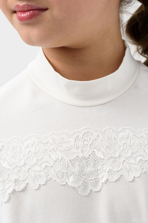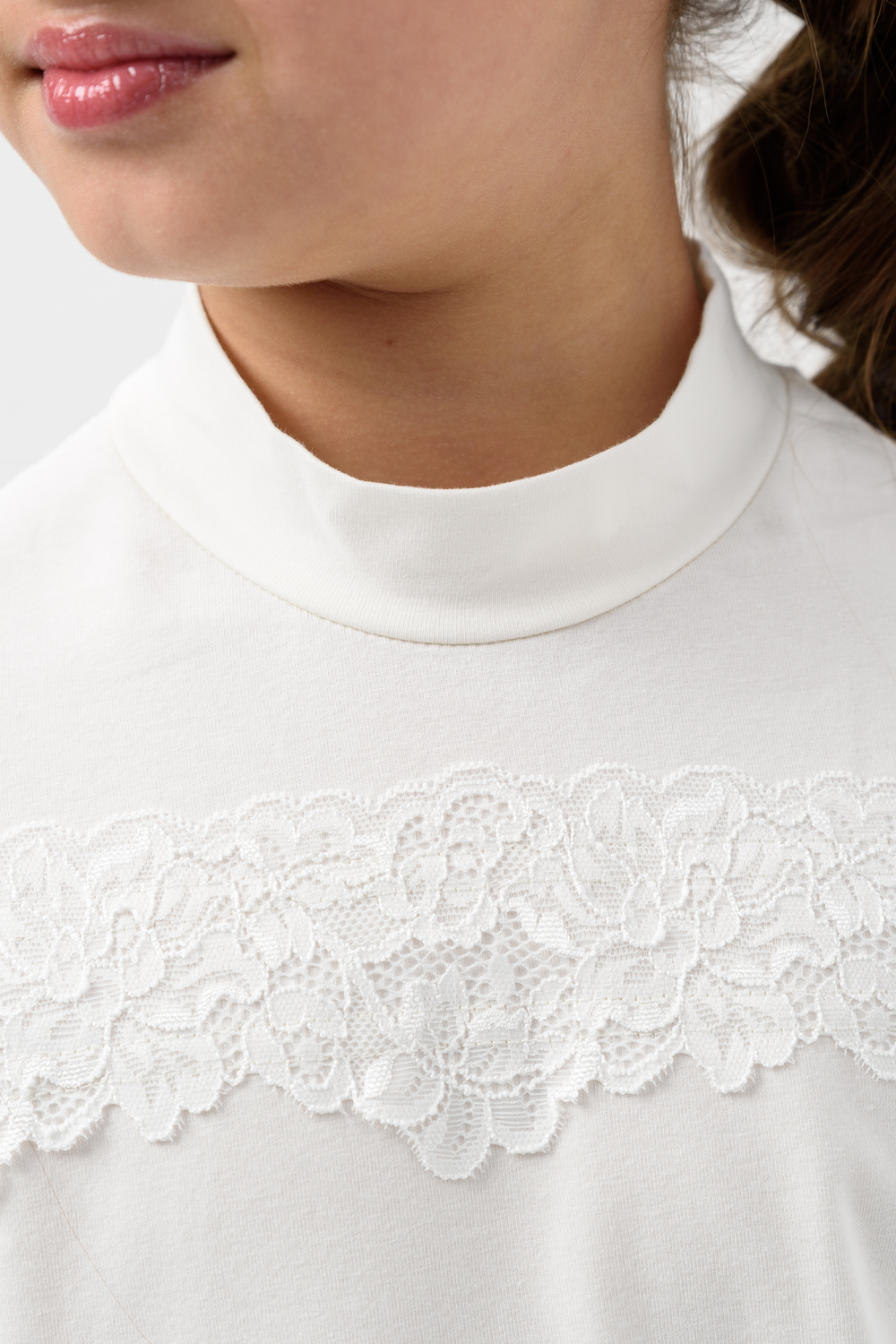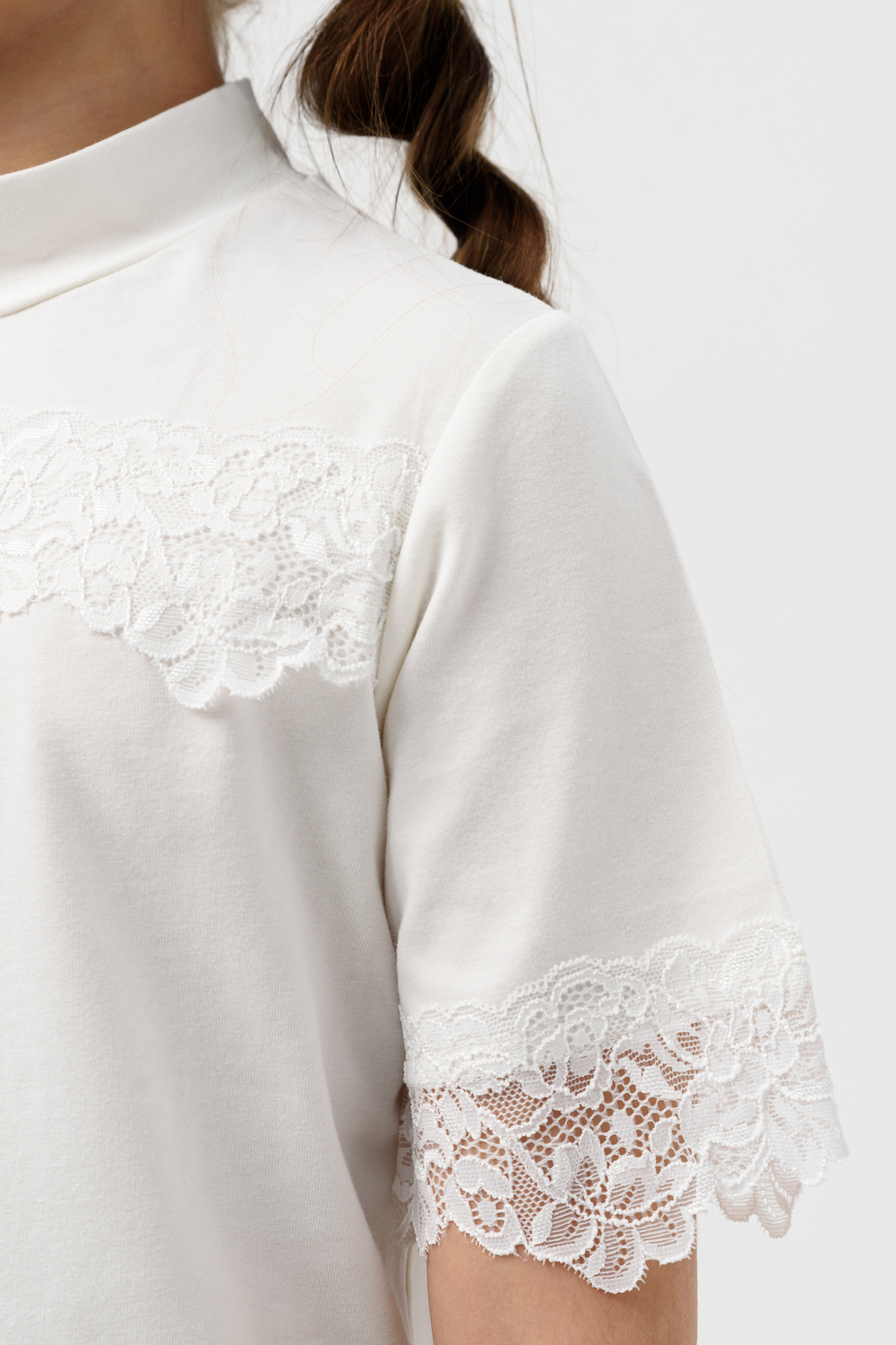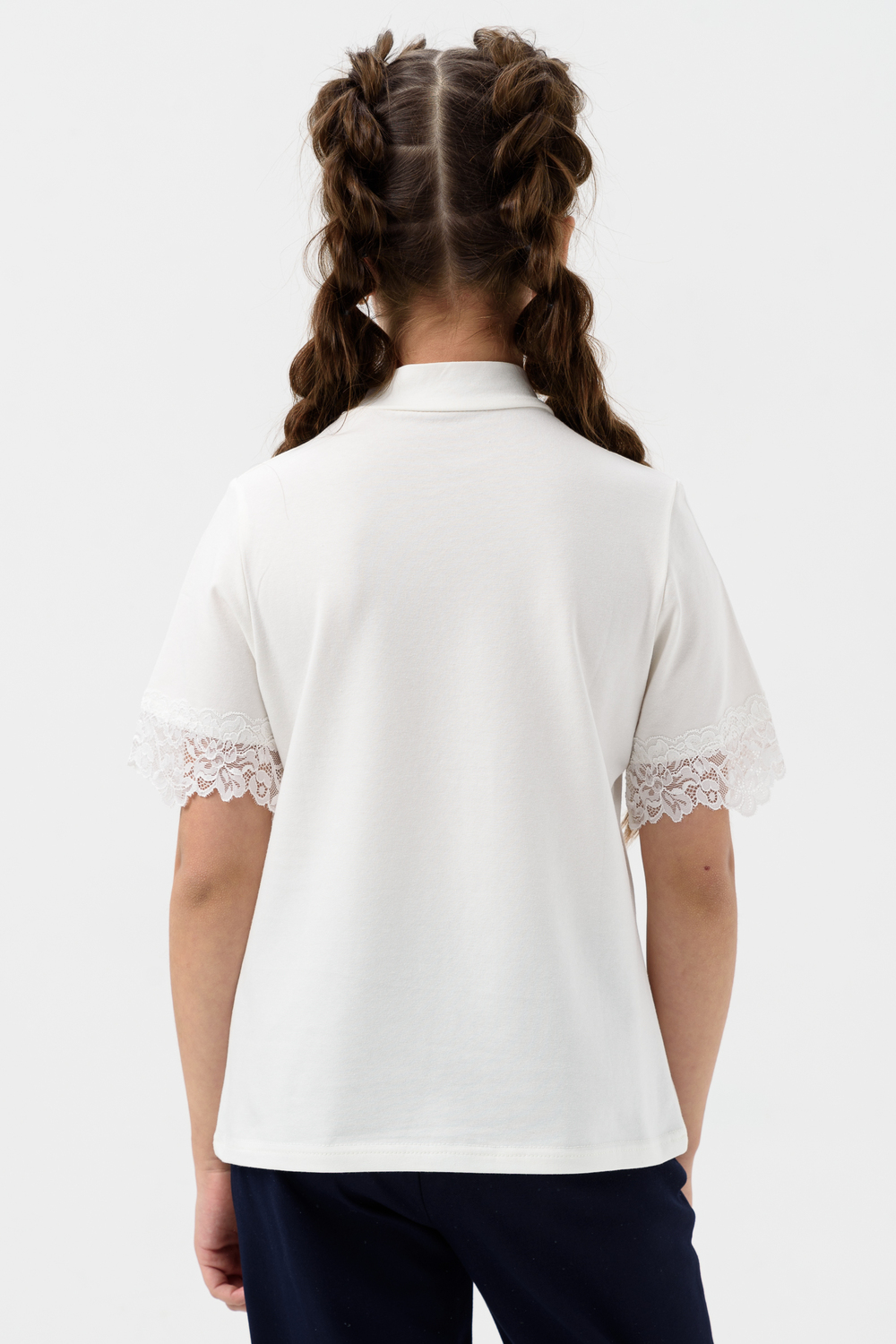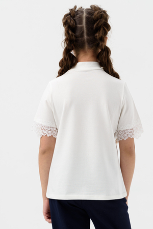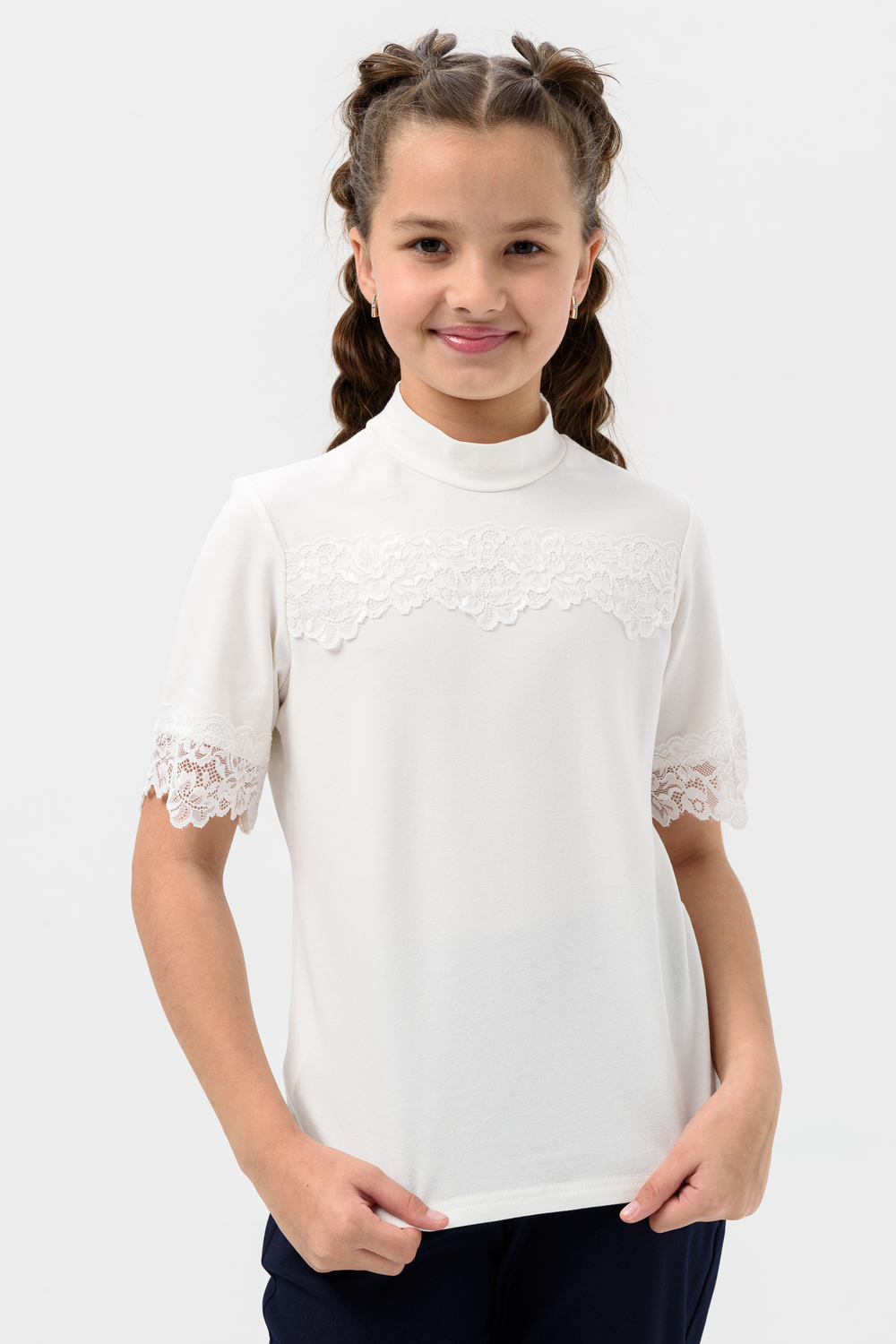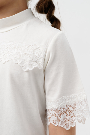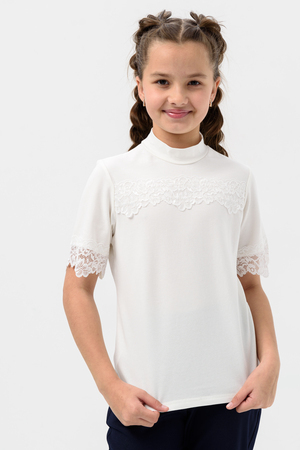 Школьная блузка для девочки с коротким рукавом. Мягкая трикотажная ткань и нежное кружево на рукавах и по переду изделия делают её универсальной - подходящей как для повседневной носки, так и для праздничных мероприятий. Узорчатый, полупрозрачный гипюр придаёт шарм этой модели. Модель составит одинаково удачный комплект и с юбкой, и с брюками. Воротник-стойка, несмотря на отсутствие застежки, хорошо тянется. Блузка сшита из качественного трикотажа, используемый материал не теряет форму после многократных стирок, мягкий и приятный к телу, устойчив к износу. Для сохранения первоначальных свойств изделия, важно соблюдать рекомендации по уходу.