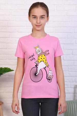 Детская футболка на девочку. Горловина круглая, втачной рукав, рукава и низ футболки обработаны в подгибку. Футболка имеет печать на полочке. Очень красивая и стильная.